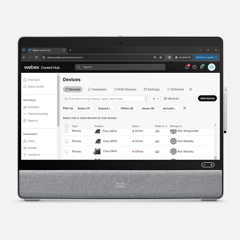 The Desk Phone 9800 Series reduces the complexity of purchasing, deploying, managing, and training. To further simplify, you can use one device for Cisco Unified Communications Manager (CUCM), Webex Calling, Broadworks, or other 3rd party cloud calling platforms. Alongside our extensive portfolio of desk devices, the 9800 series is uniquely positioned in the market to help transform the workplace by bridging the gap between hybrid work, calling, and meetings – and is the most cost-effective solution for workstations at scale.